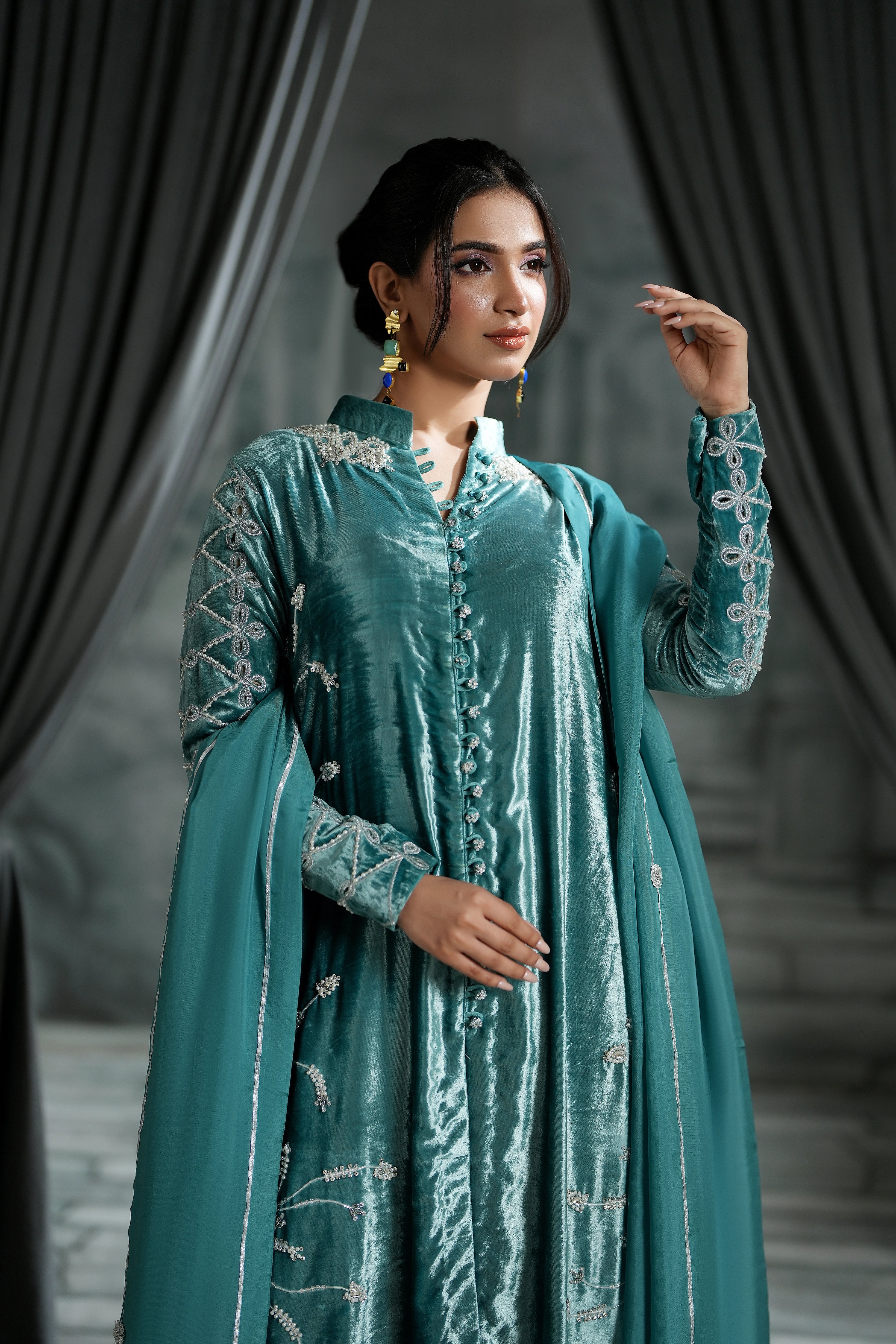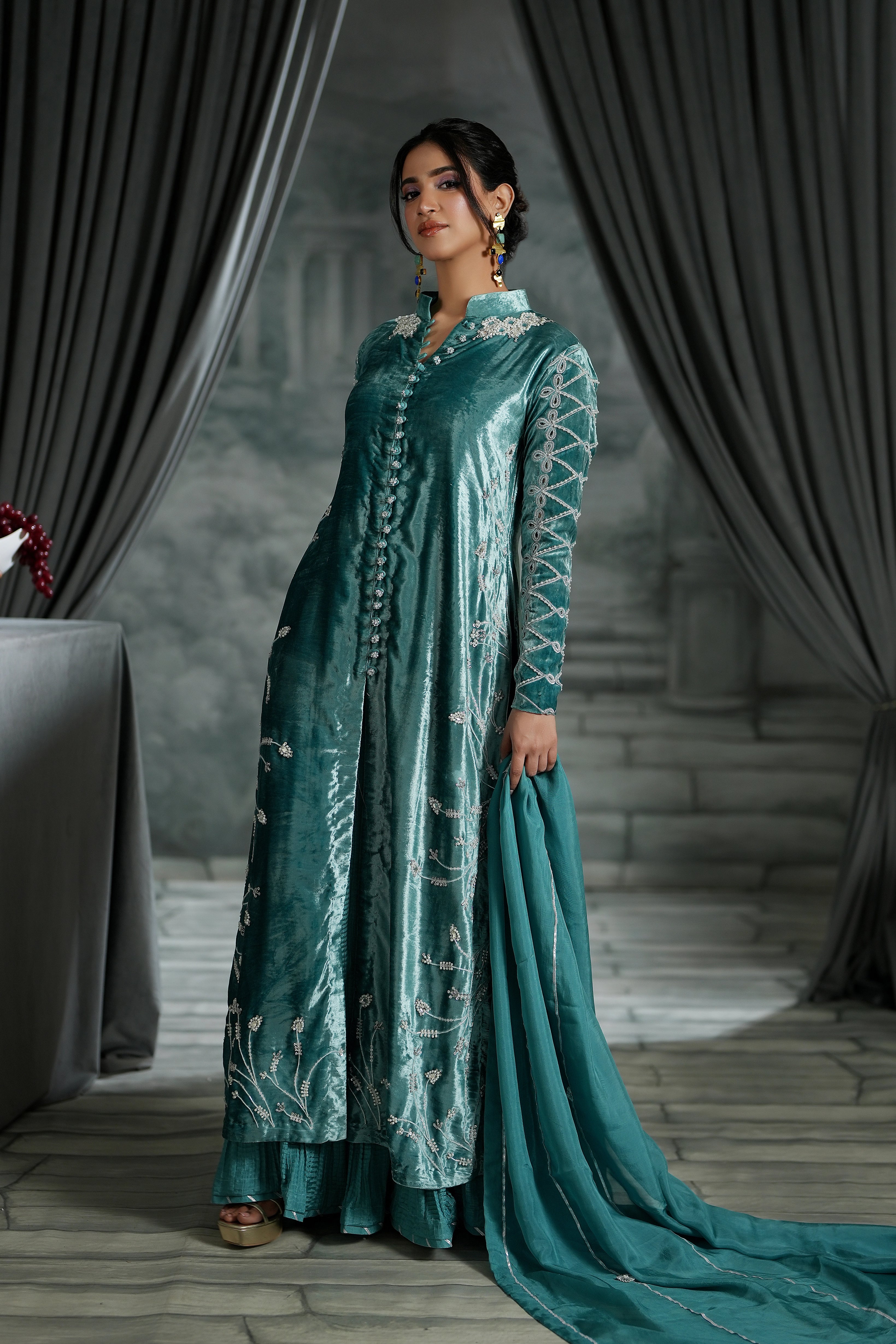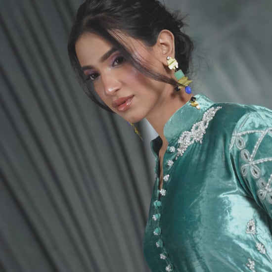 Our stunning long jacket, crafted from rich, pure aqua blue velvet. This piece is a true work of art, featuring dazzling crystal work, delicate thread embroidery, and exquisite cutwork throughout. The combination of luxurious velvet and intricate detail ensures you command attention.
