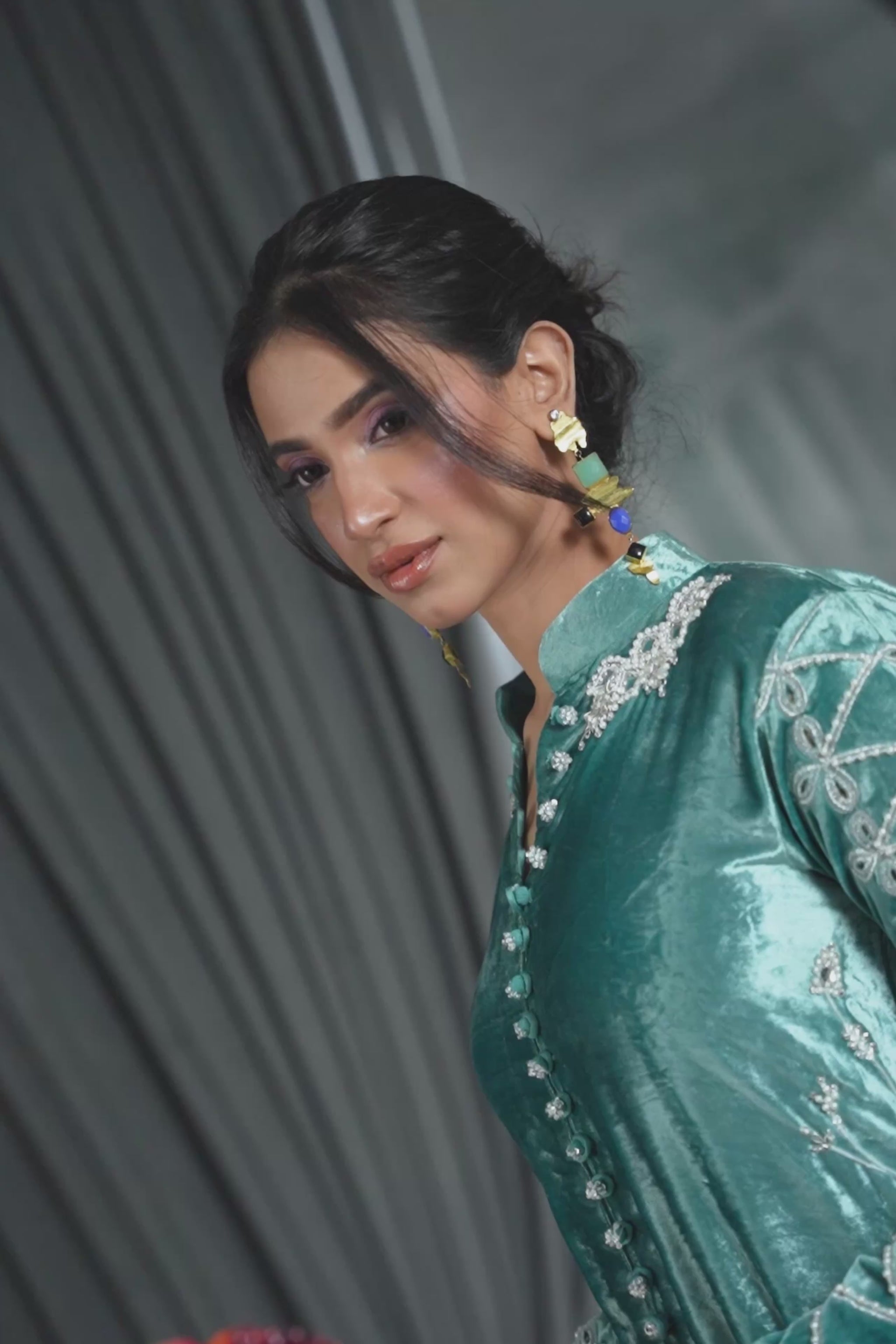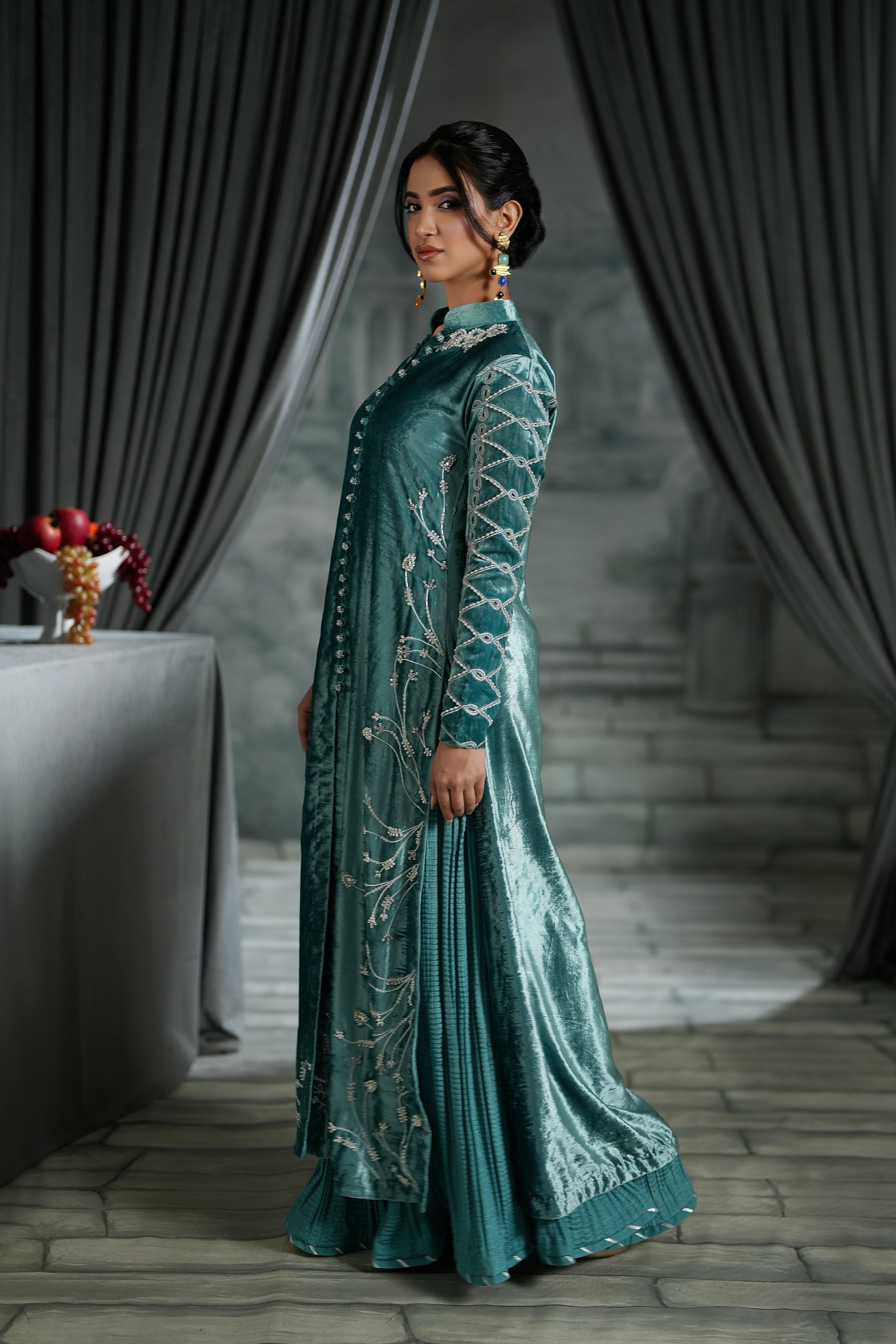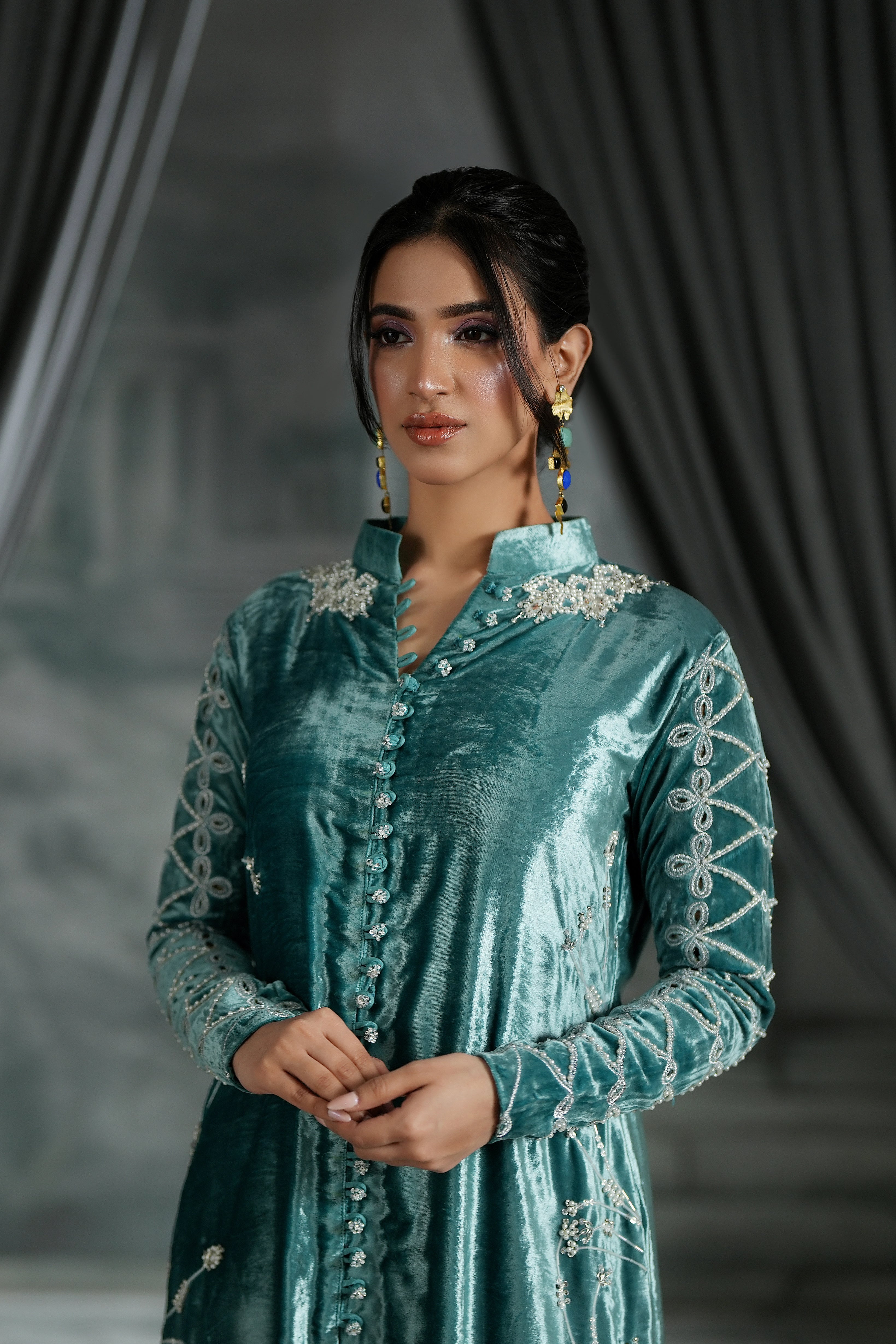 Our stunning long jacket, crafted from rich, pure aqua blue velvet. This piece is a true work of art, featuring dazzling crystal work, delicate thread embroidery, and exquisite cutwork throughout. The combination of luxurious velvet and intricate detail ensures you command attention.