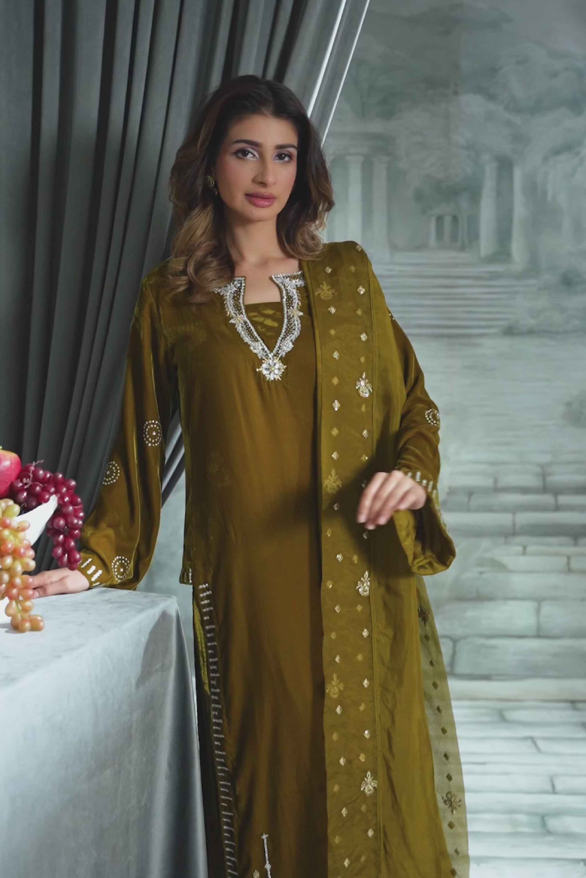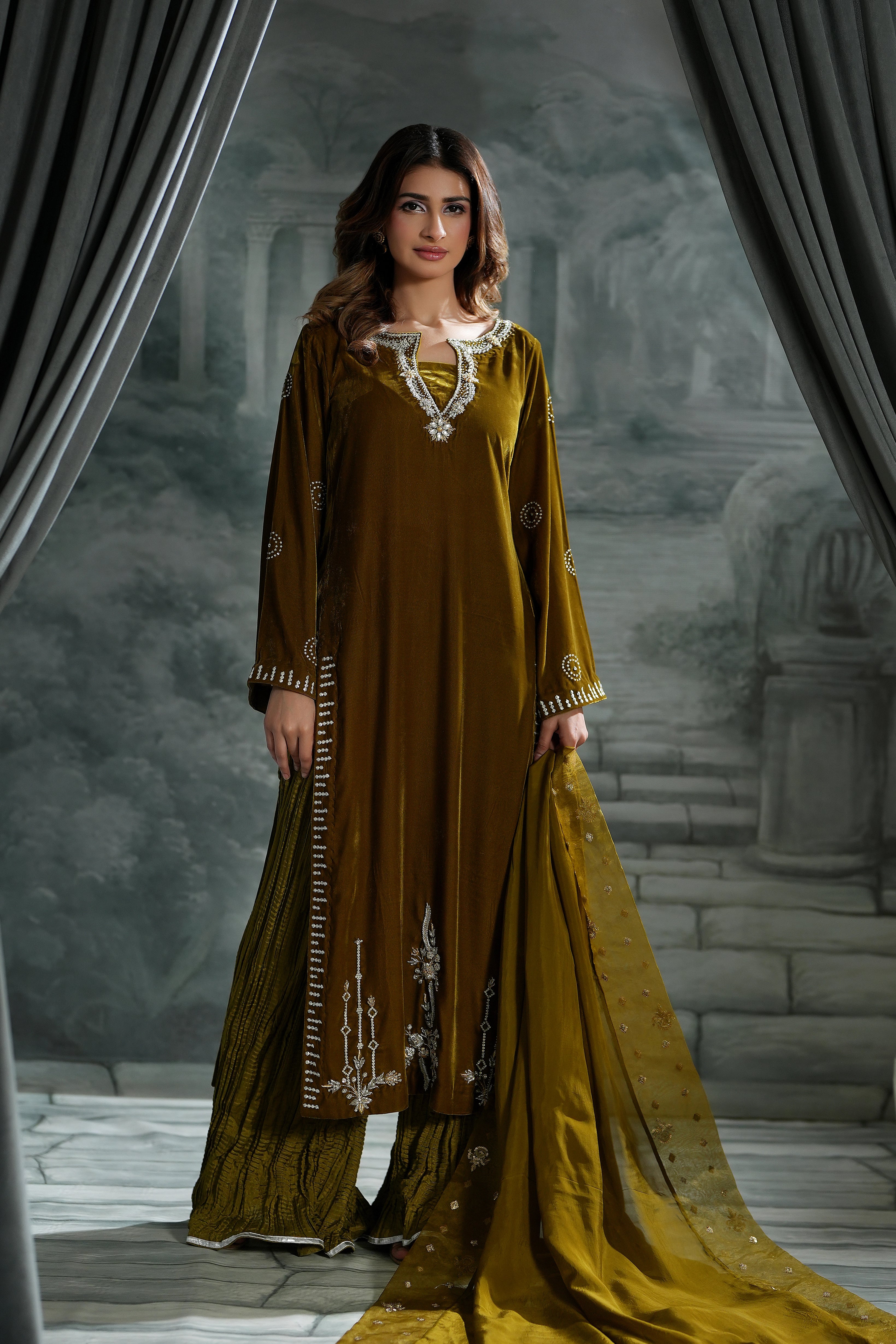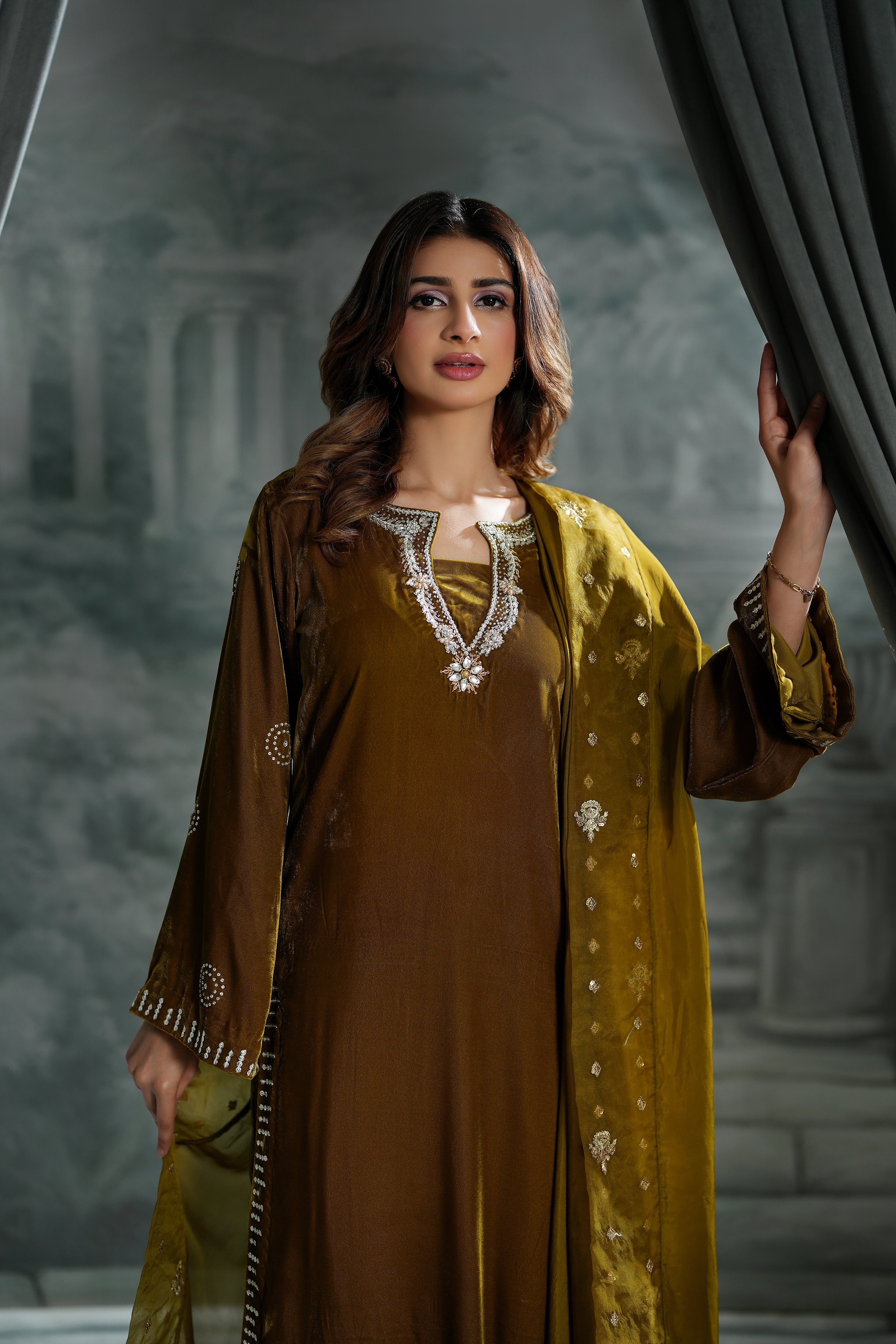 This striking Mustard Brown Long Shirt. The rich hue is instantly elevated by exquisite silver sequins work, glittering crystal work, and shimmering stones. Paired with a gorgeously textured crushed Dhaka, this ensemble is ready for any grand celebration.