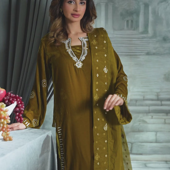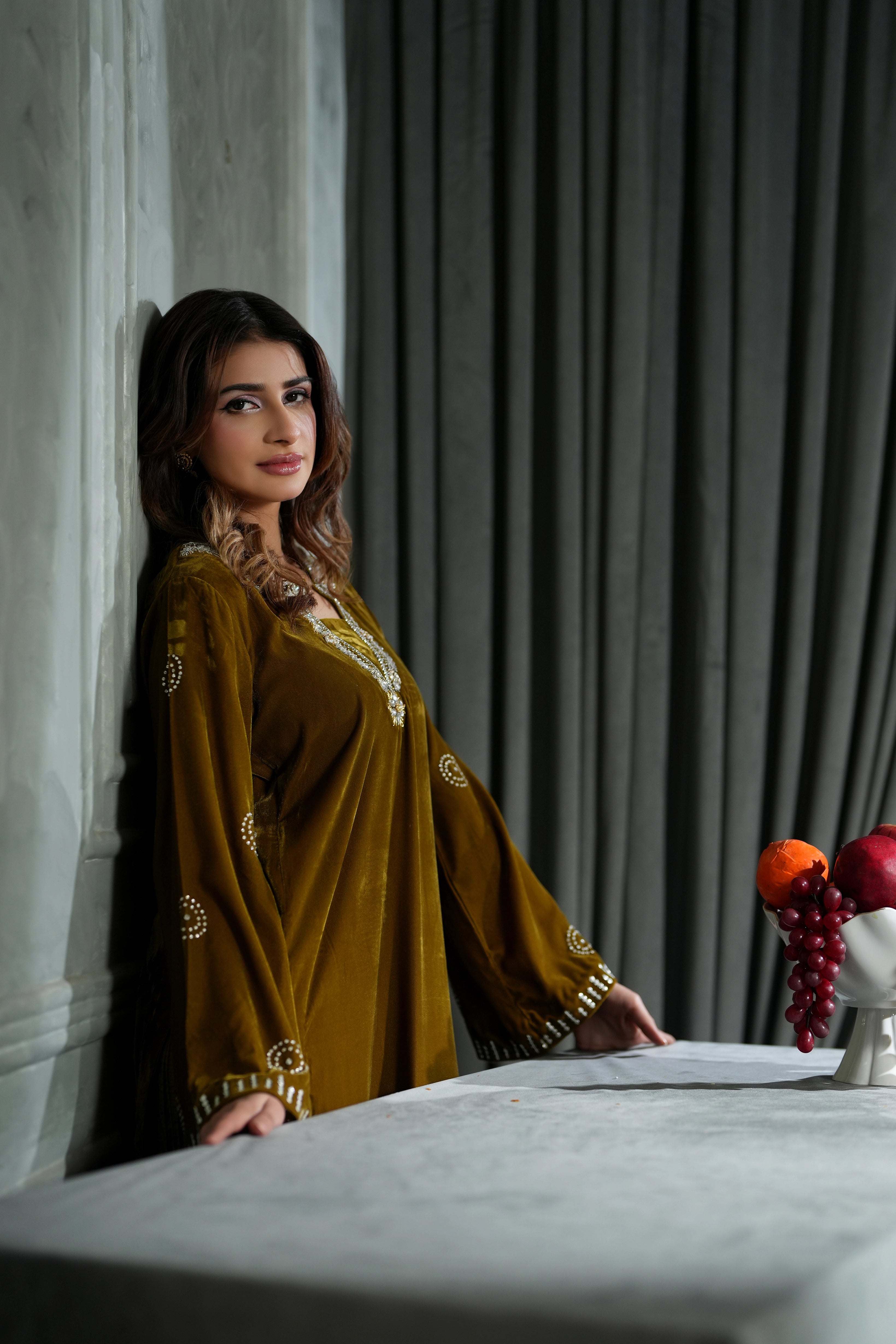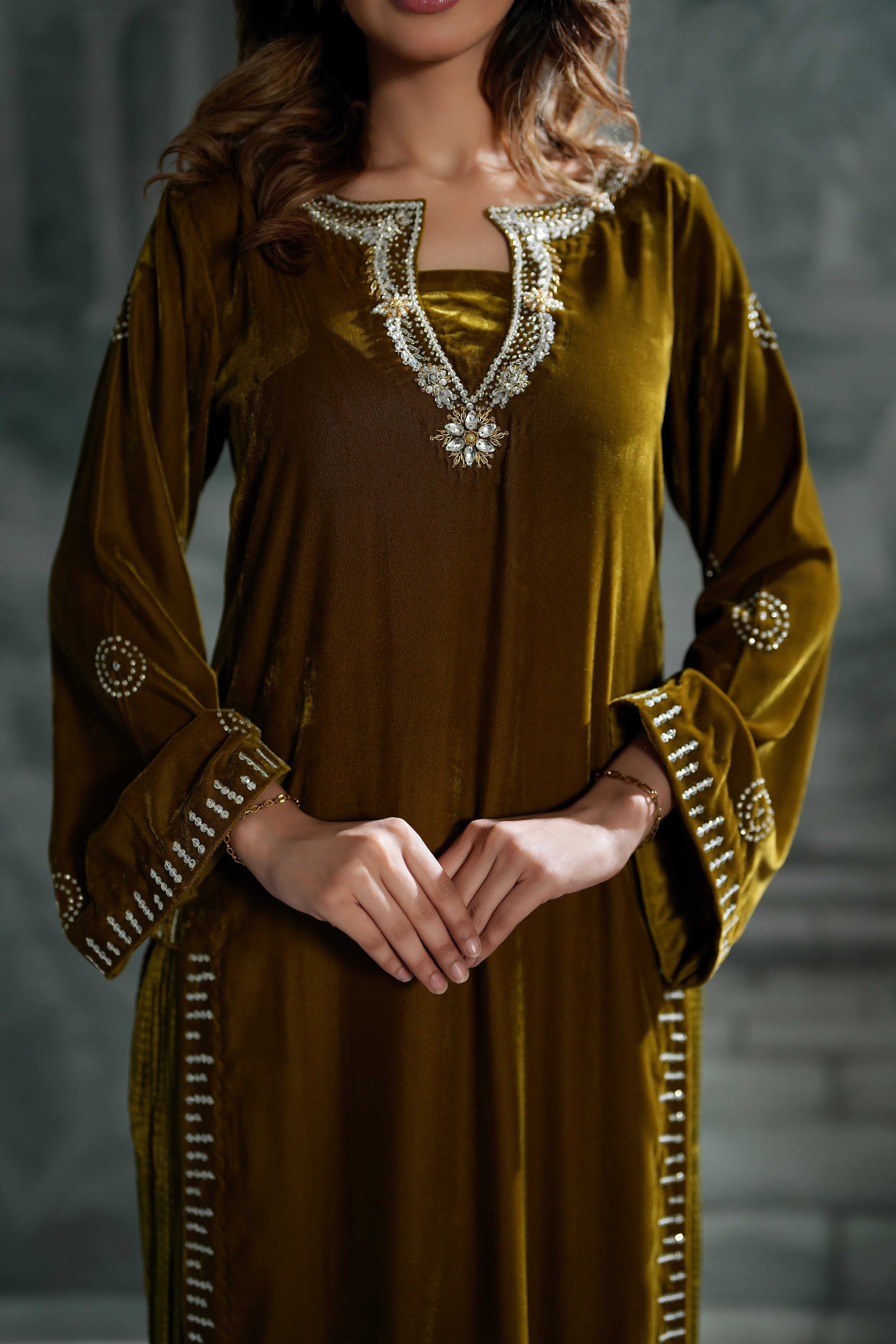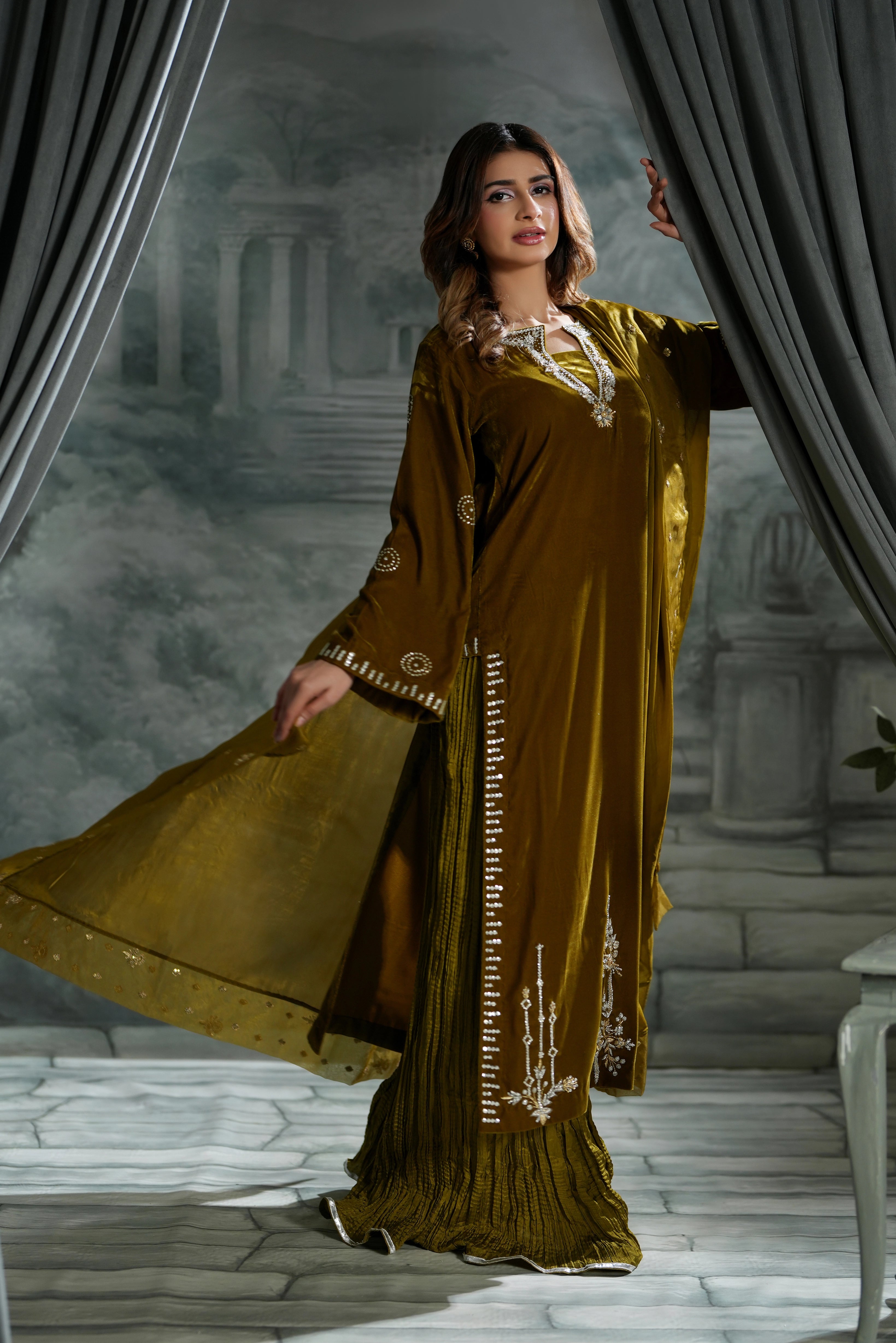 This striking Mustard Brown Long Shirt. The rich hue is instantly elevated by exquisite silver sequins work, glittering crystal work, and shimmering stones. Paired with a gorgeously textured crushed Dhaka, this ensemble is ready for any grand celebration.