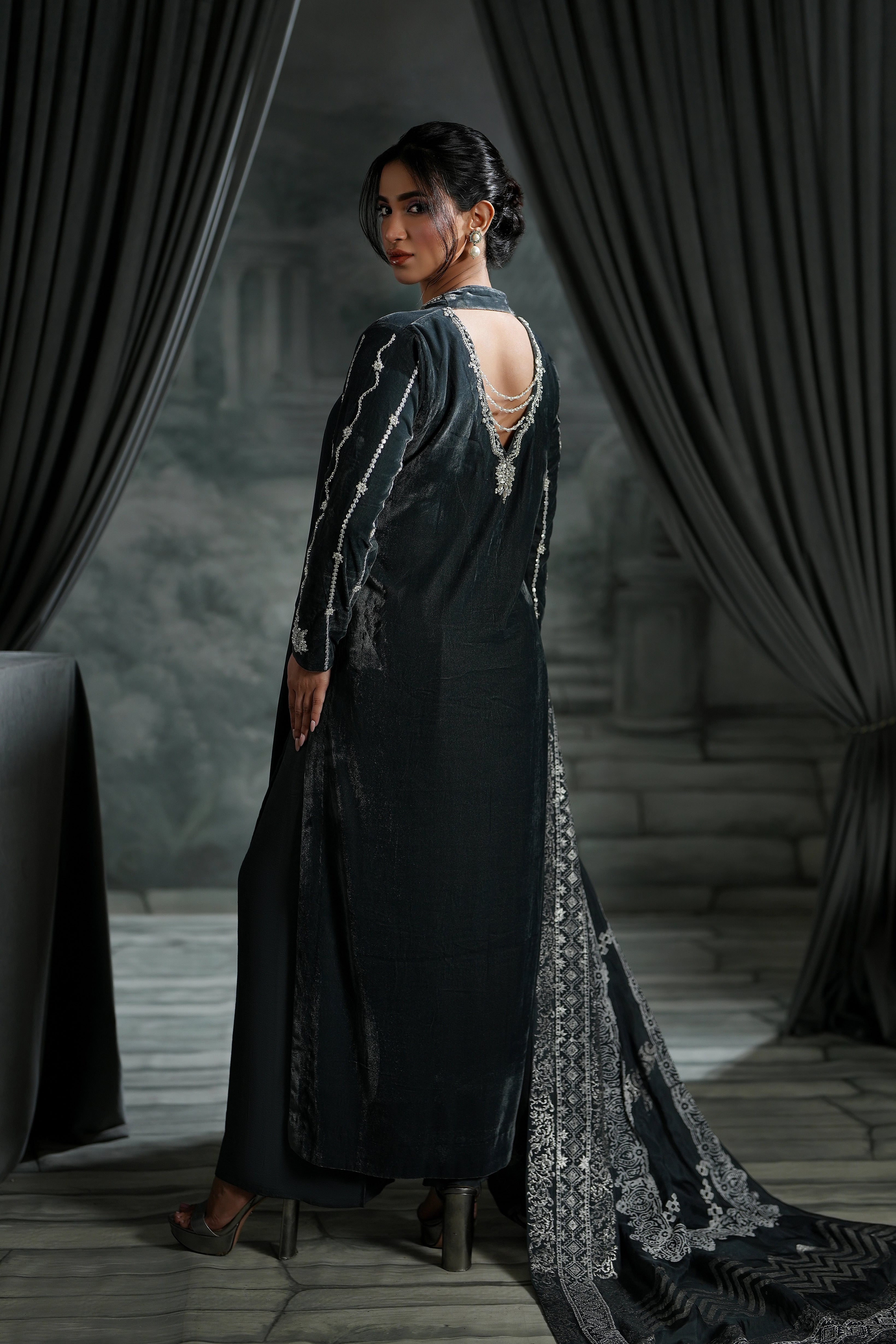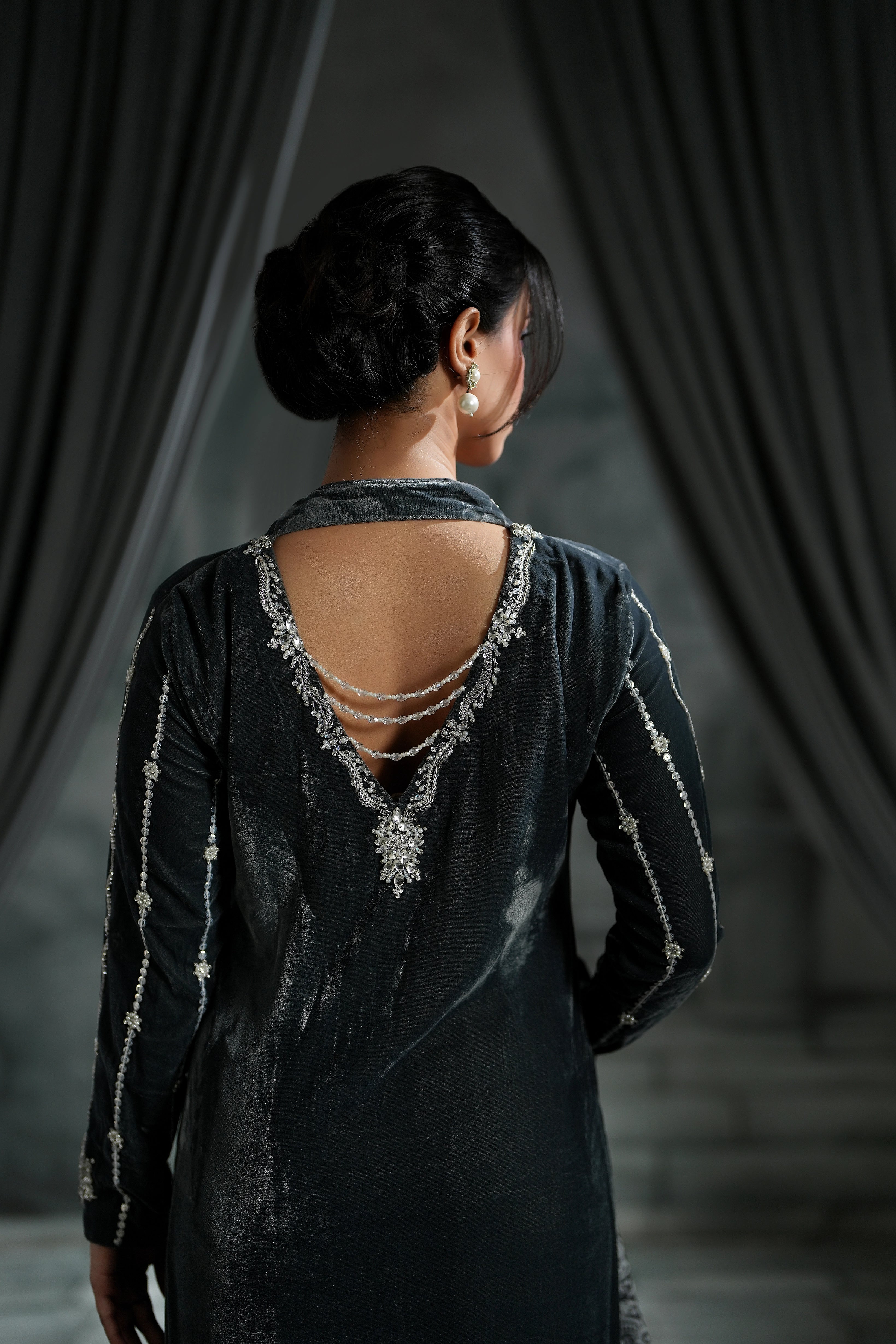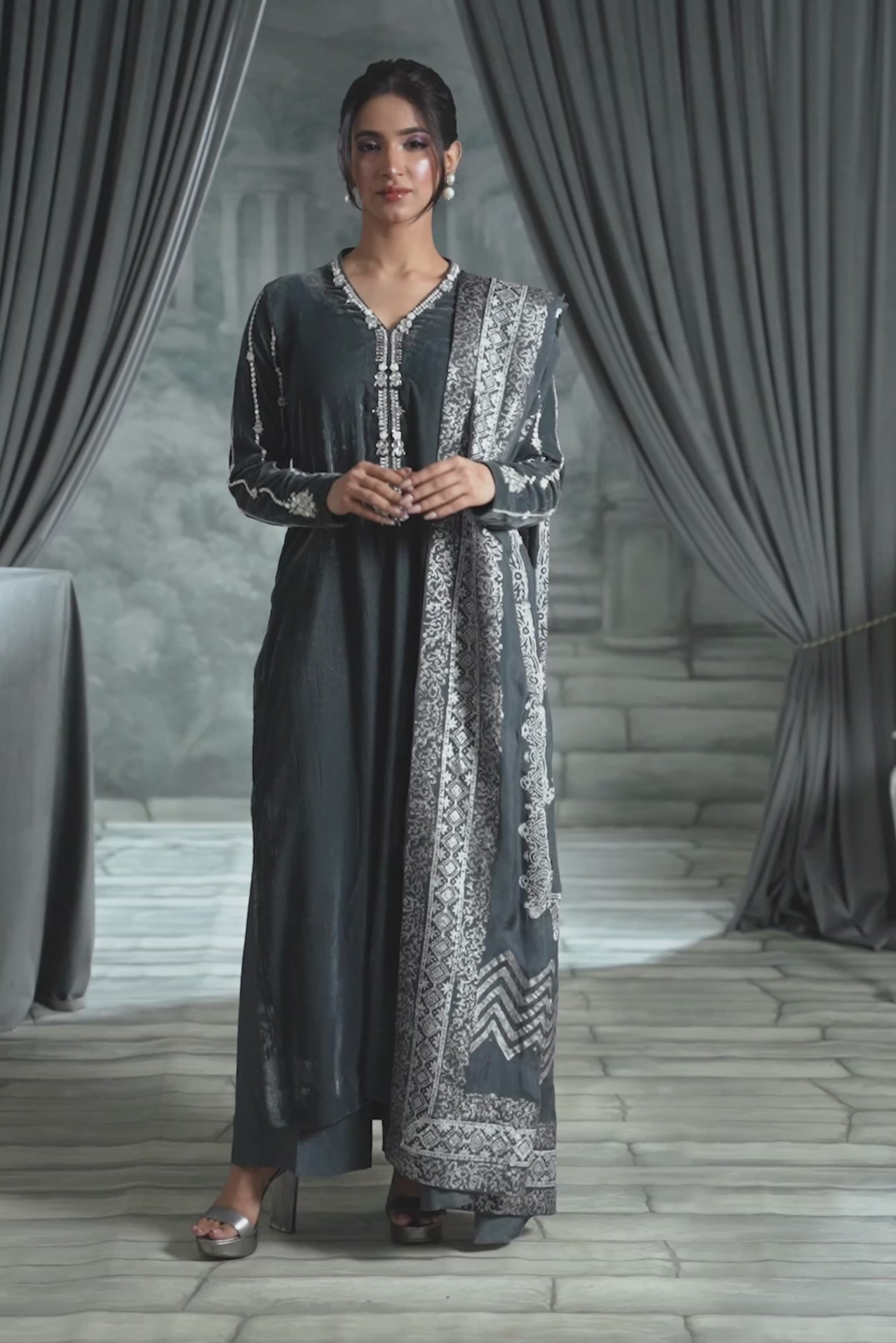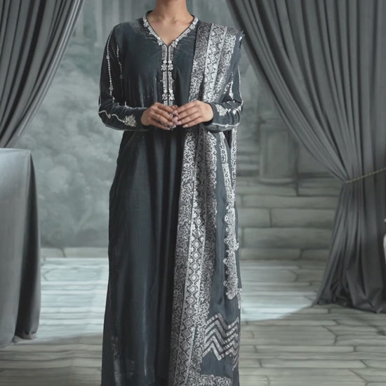 This grey long shirt is the definition of modern elegance, featuring a bold deep neck and a chic, trendy back design. The detailing is breathtaking: shimmering crystal sequins, dazzling stones, and delicate pearls.Paired with a vibrant, handcrafted block print dupatta on pure silk, this ensemble offers the perfect mix of high-fashion glamour and cultural richness.