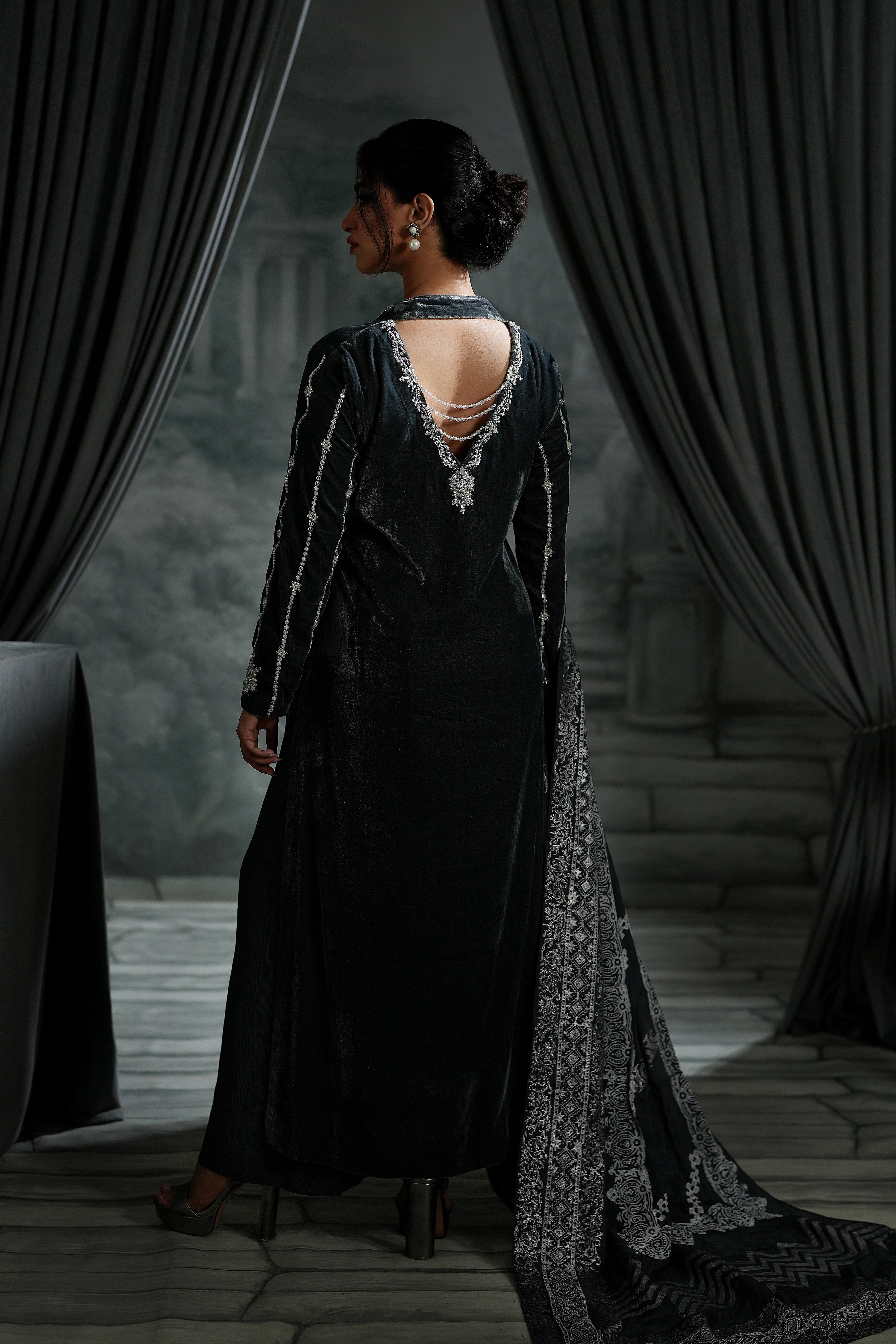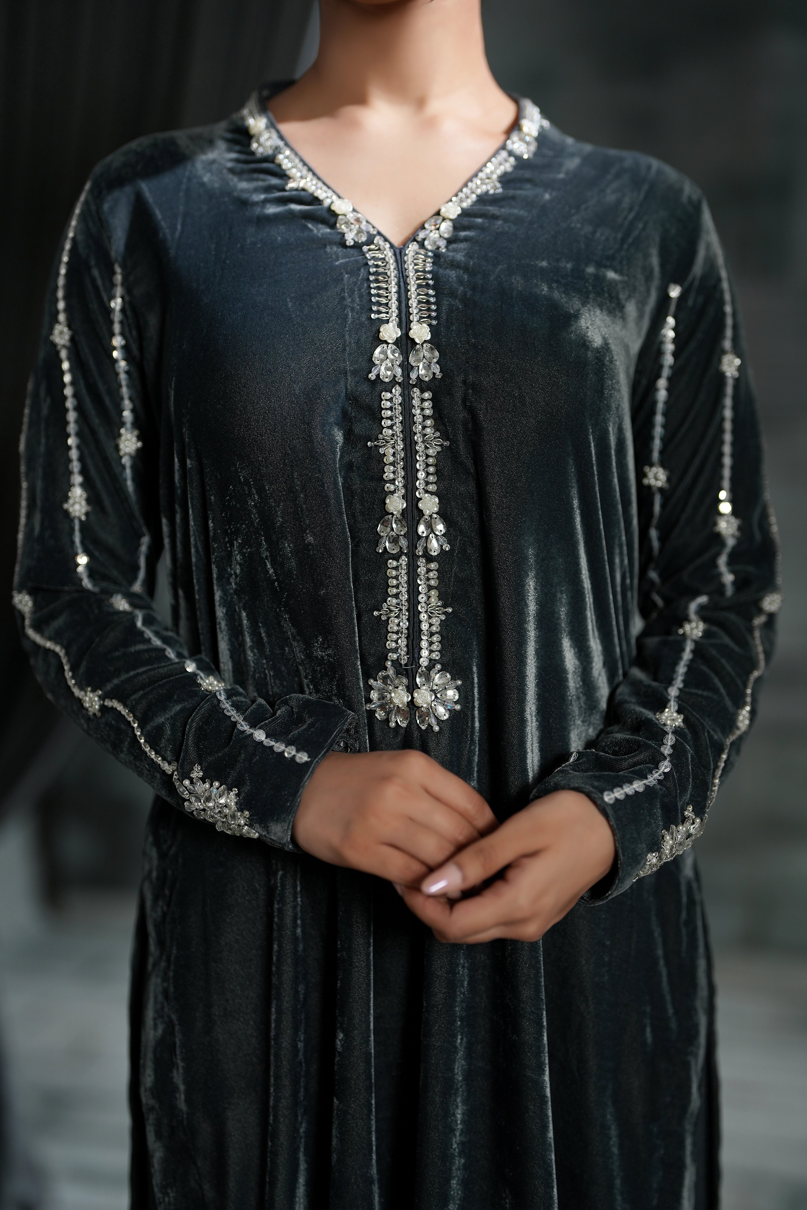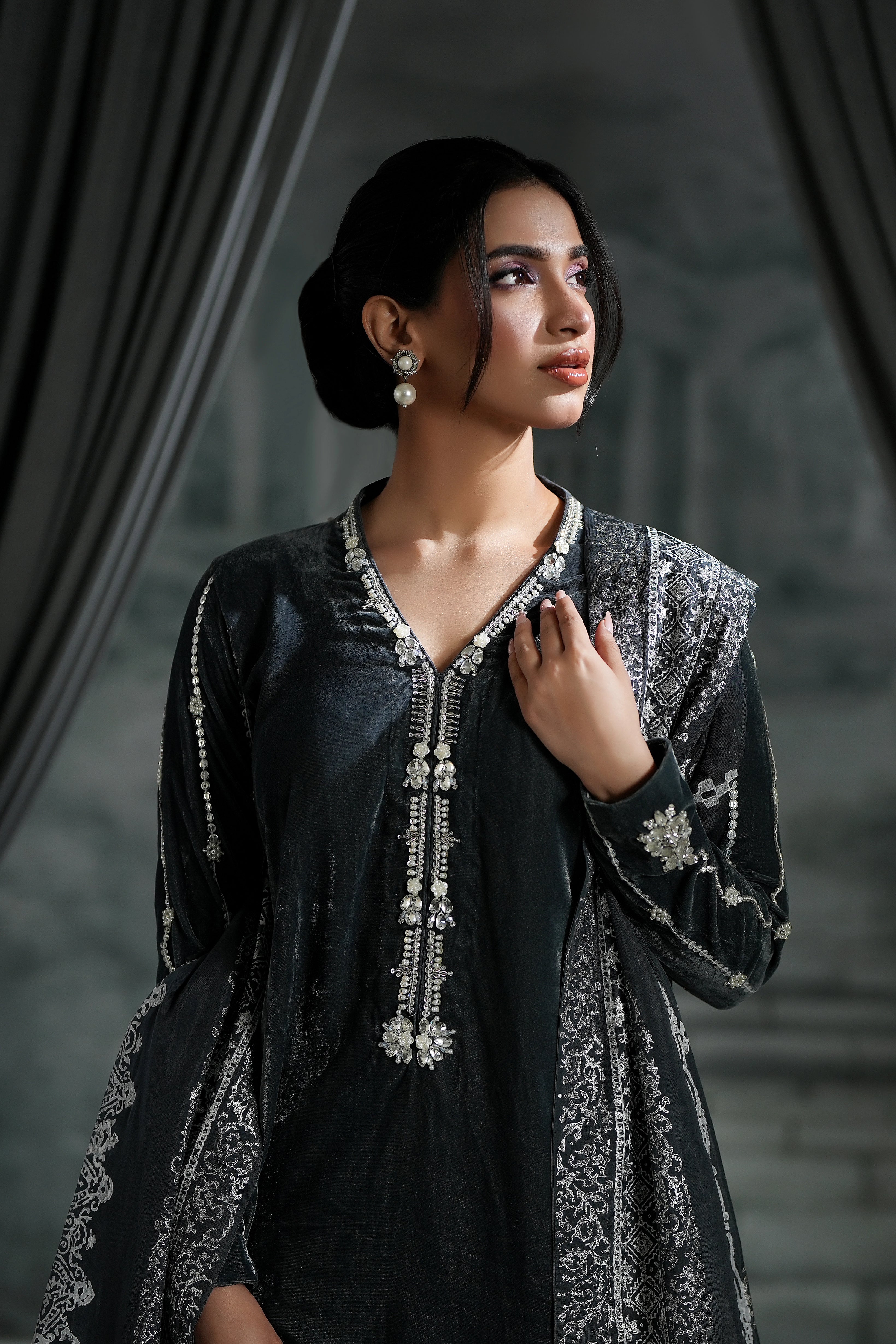 This grey long shirt is the definition of modern elegance, featuring a bold deep neck and a chic, trendy back design. The detailing is breathtaking: shimmering crystal sequins, dazzling stones, and delicate pearls.Paired with a vibrant, handcrafted block print dupatta on pure silk, this ensemble offers the perfect mix of high-fashion glamour and cultural richness.