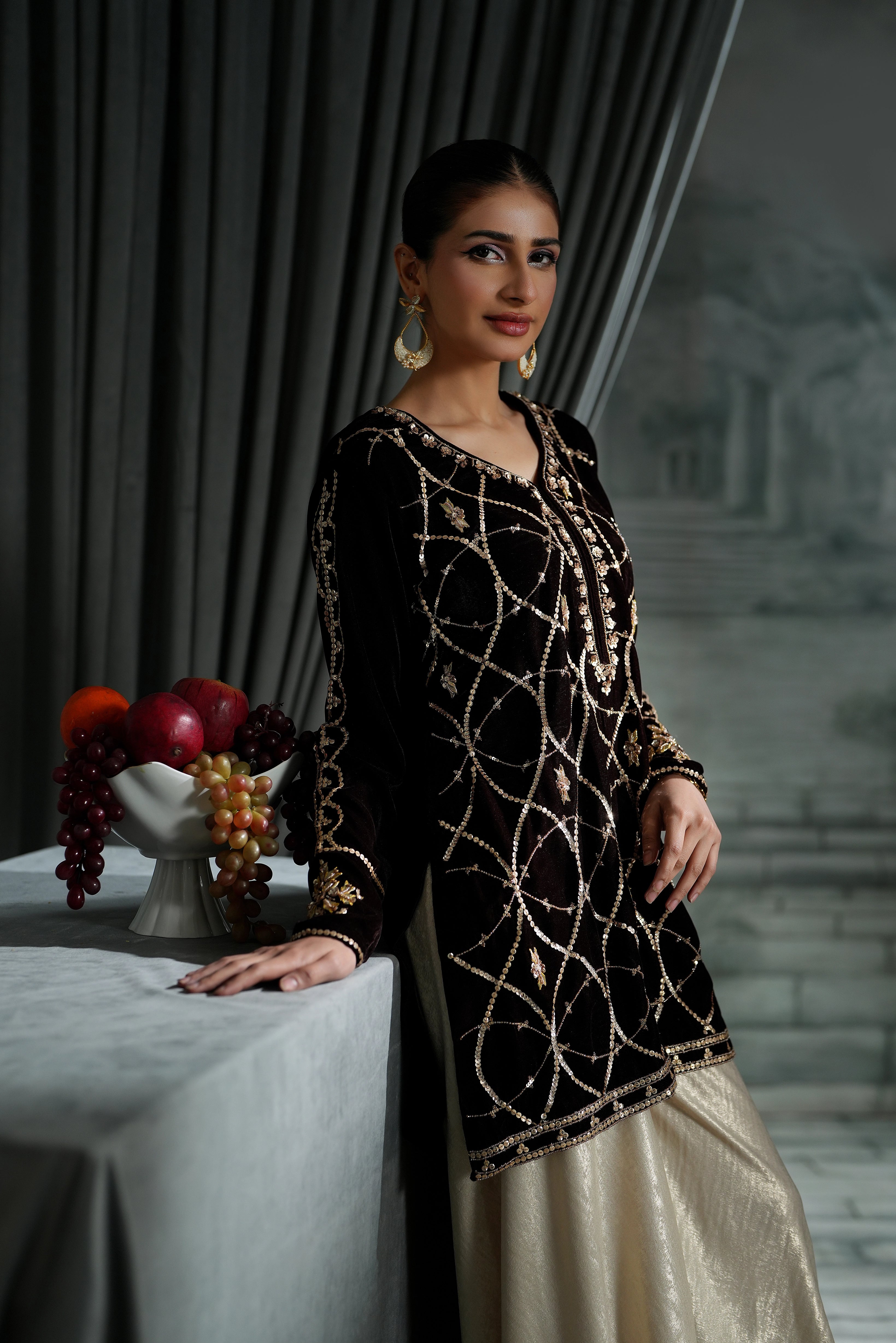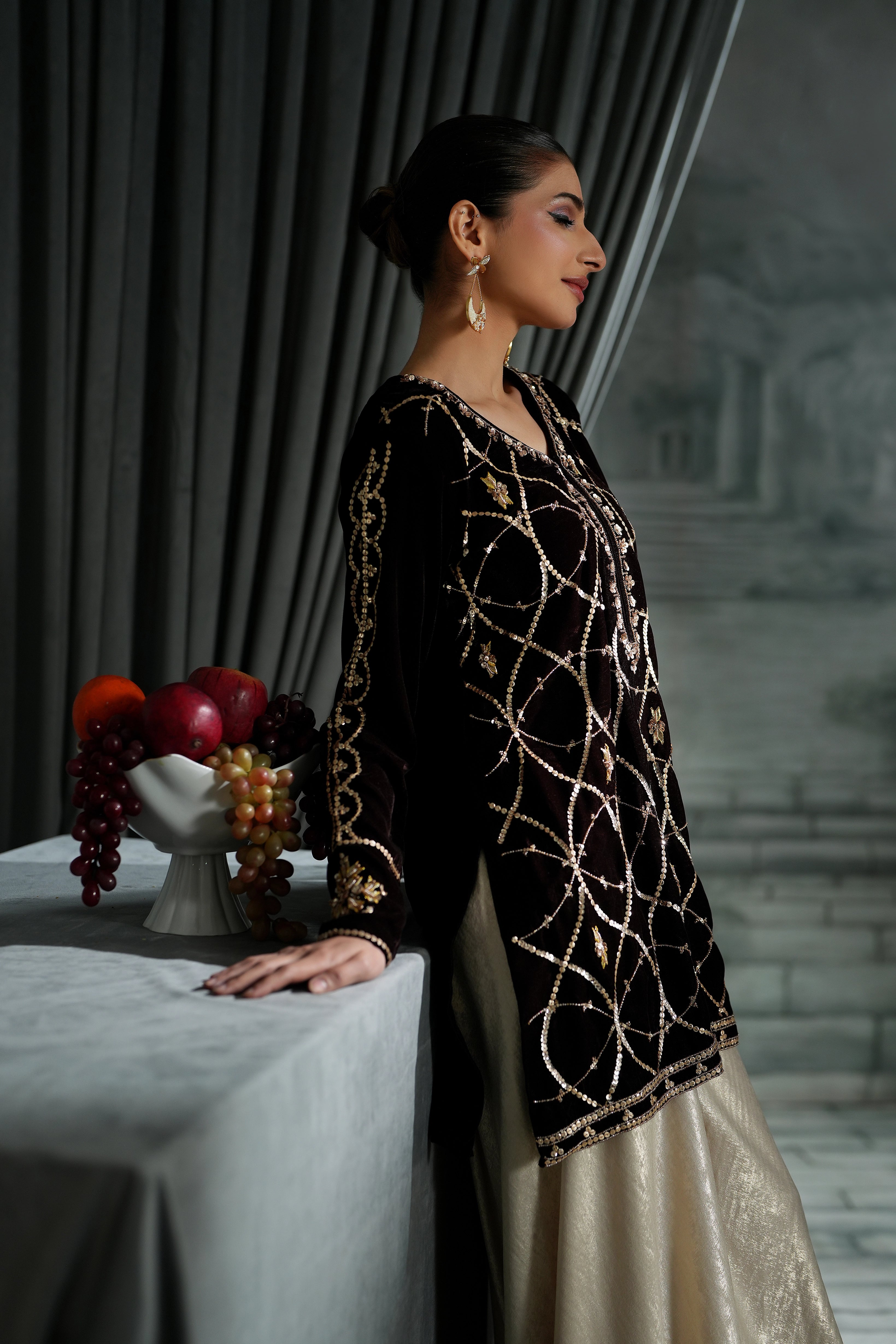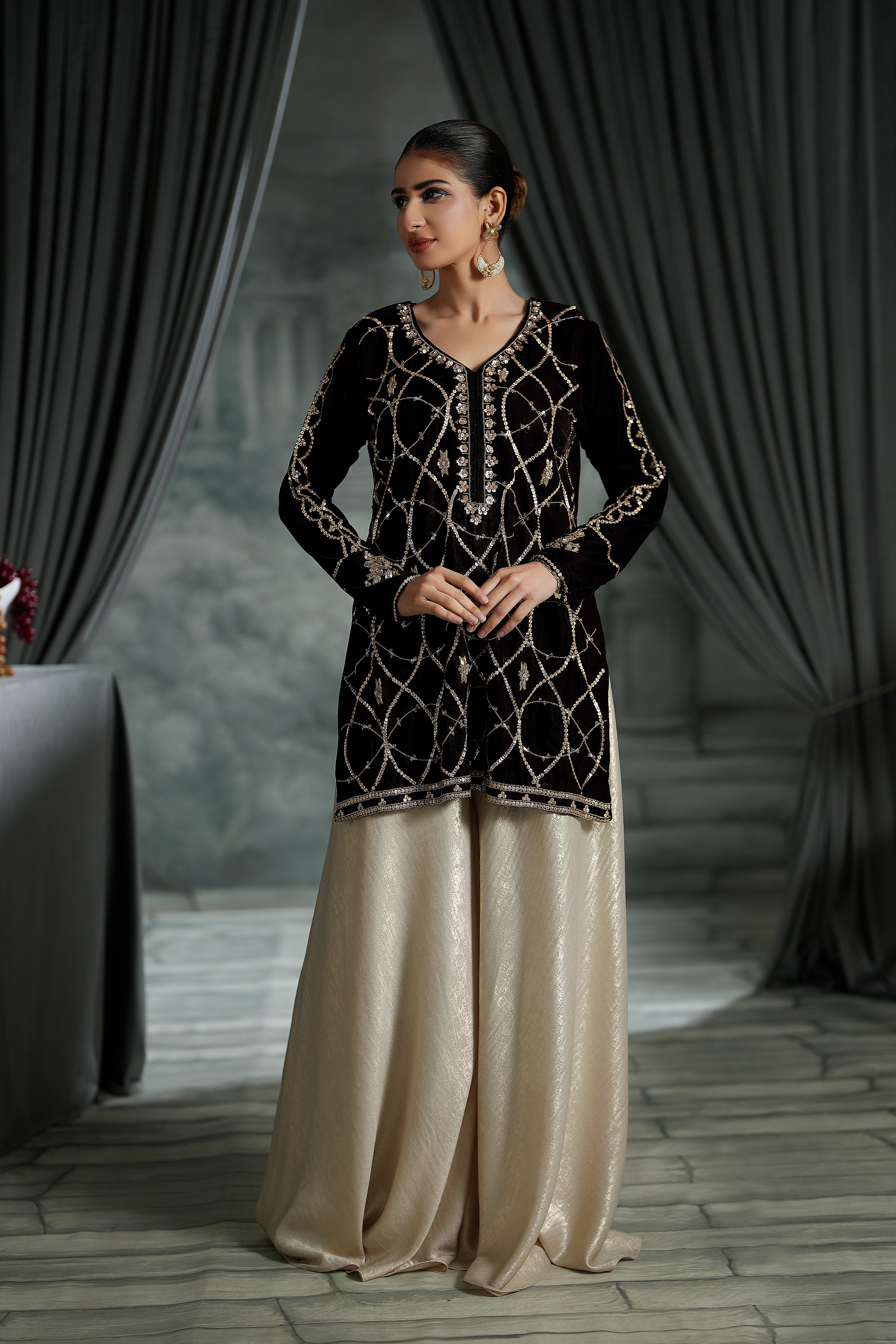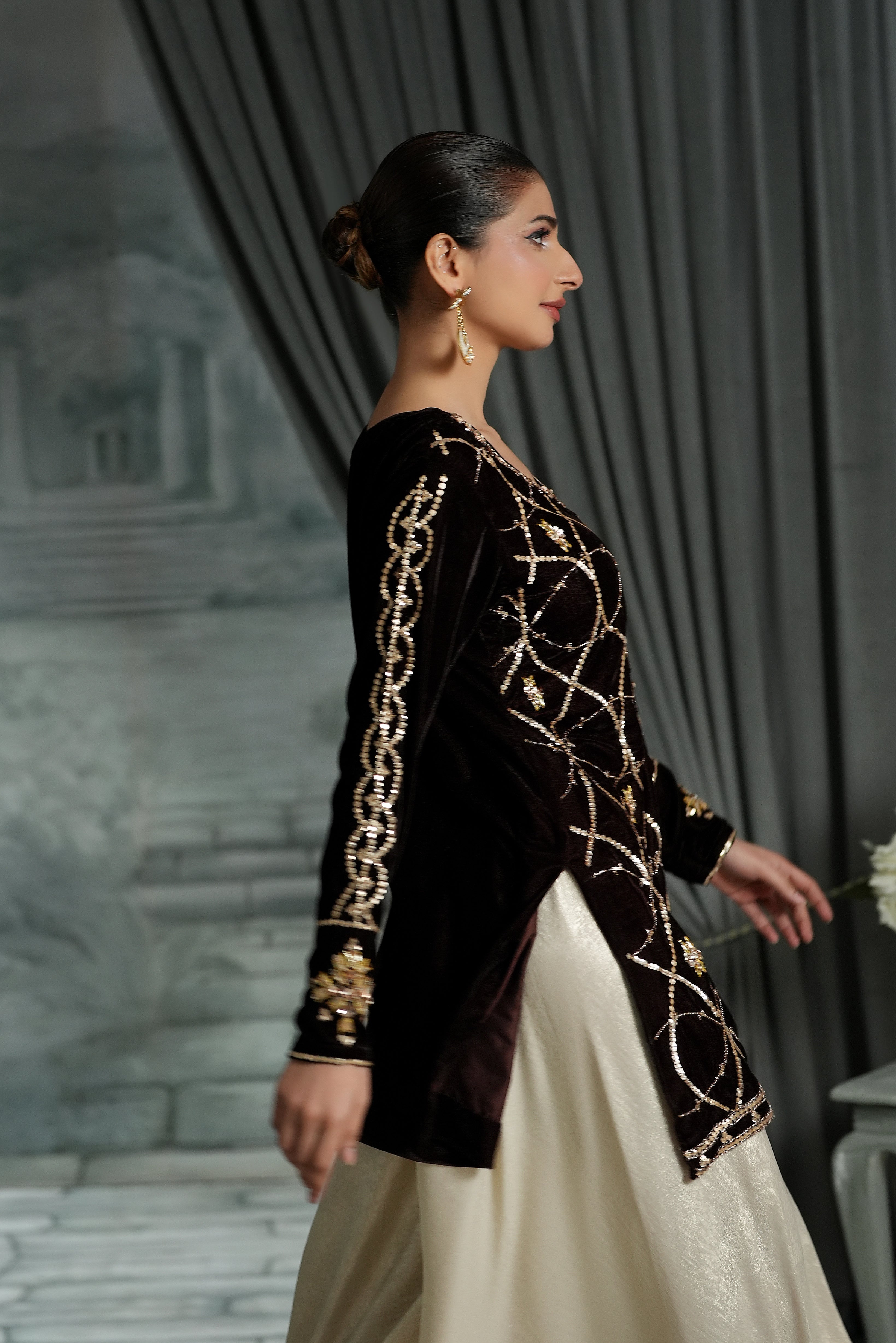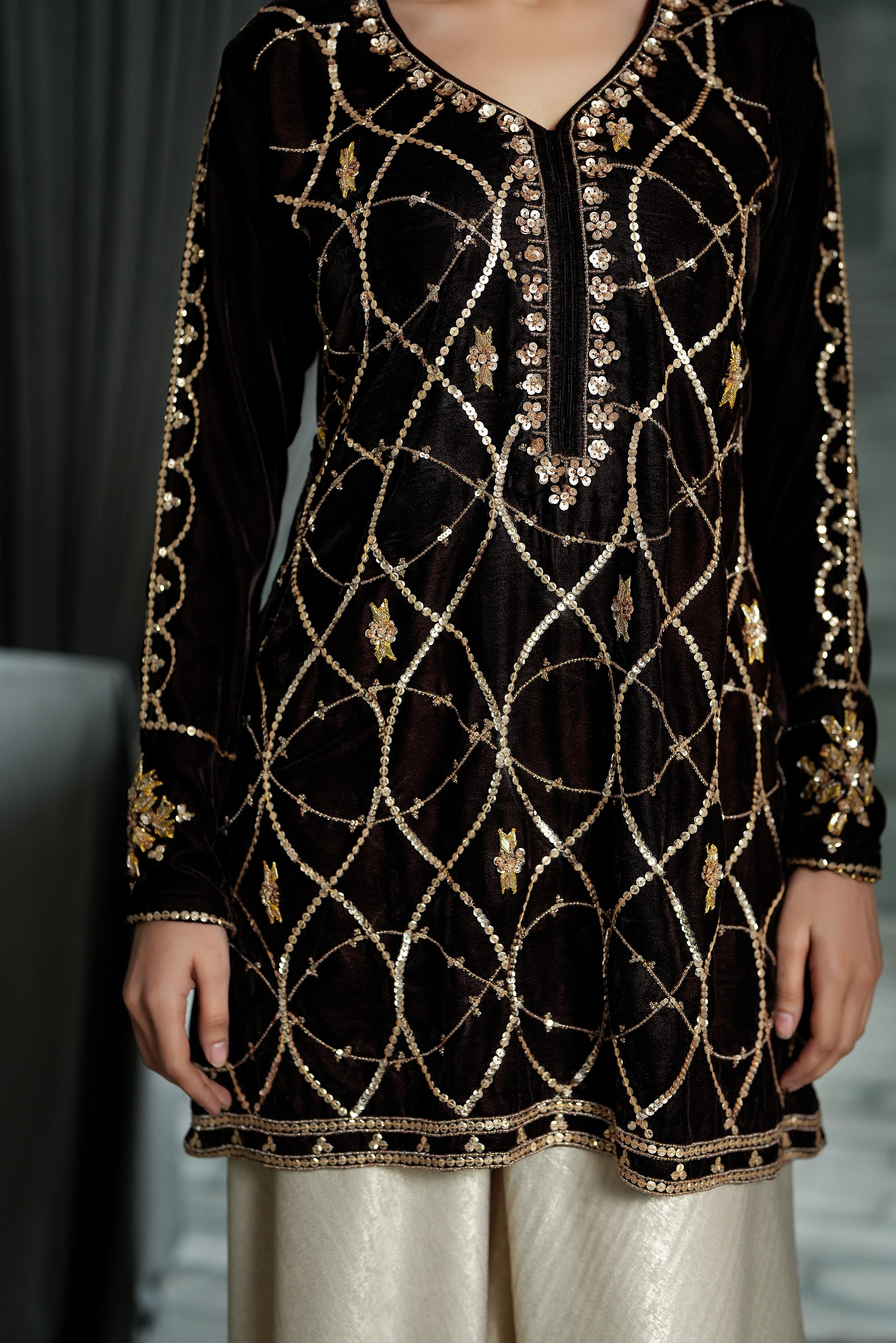 Indulge in the deep beauty of our Chocolate Brown Short Shirt. While the color is grounding and sophisticated, the details make it unforgettable: featuring intricate sequins, traditional Gotta work, and dazzling crystal embellishments.