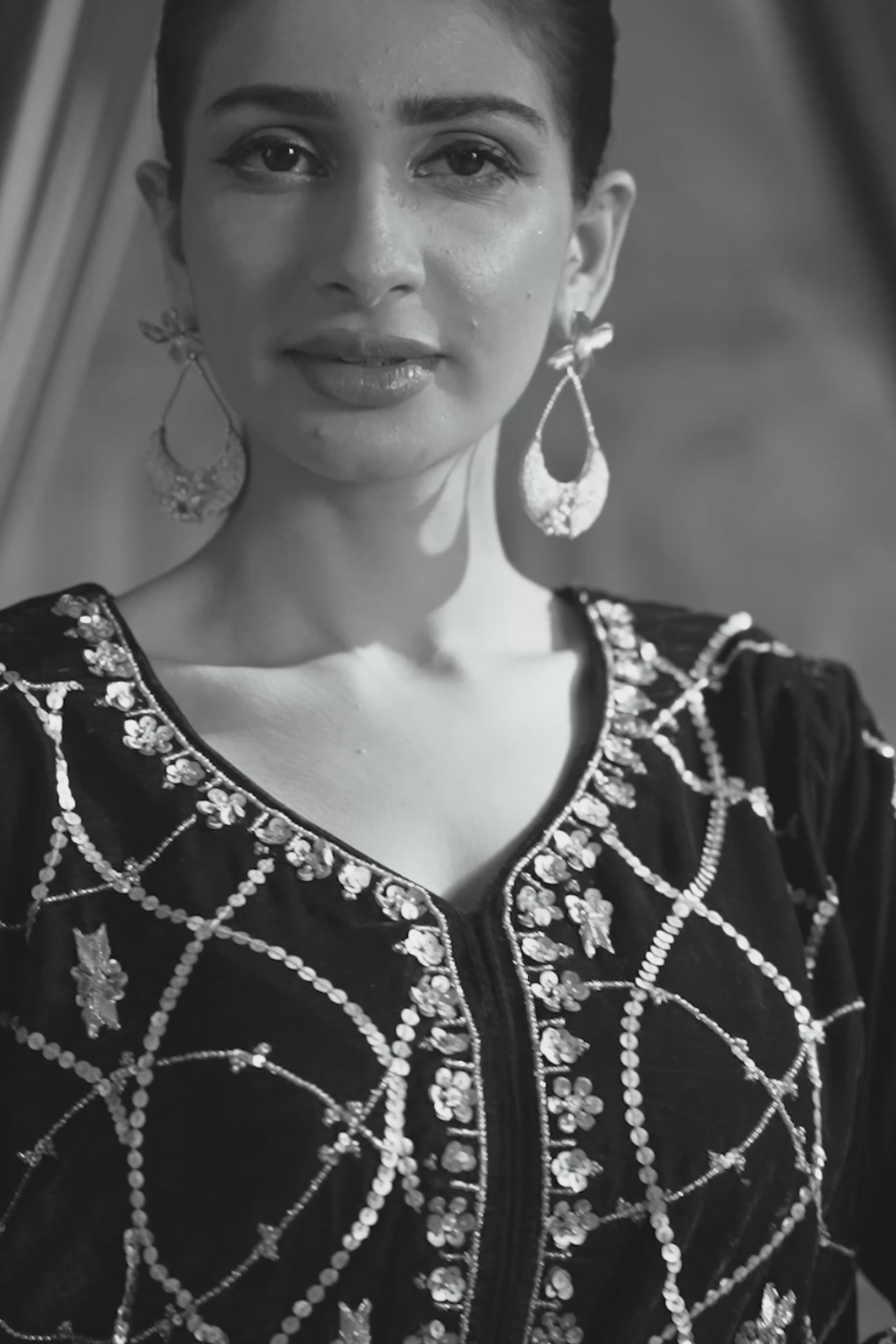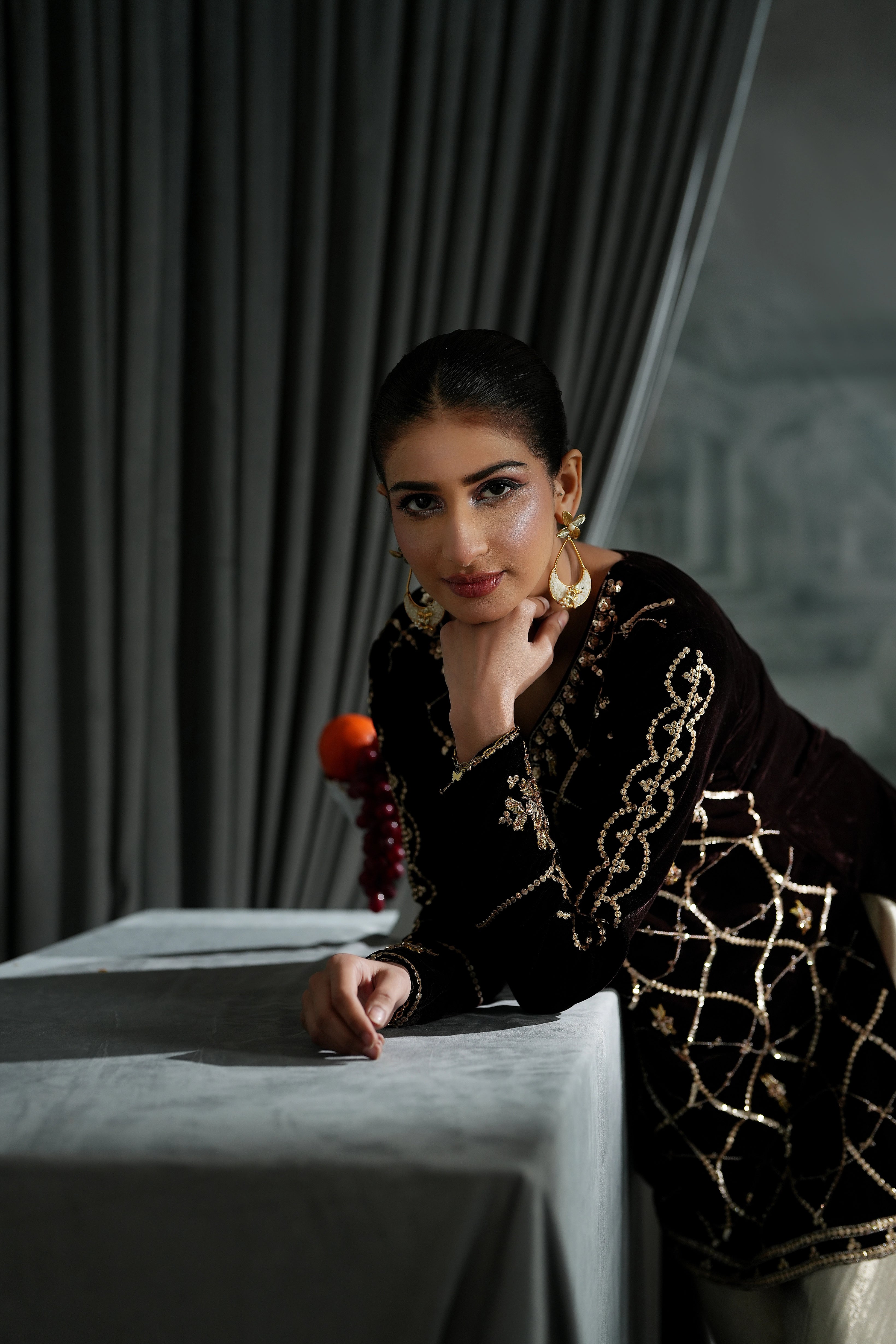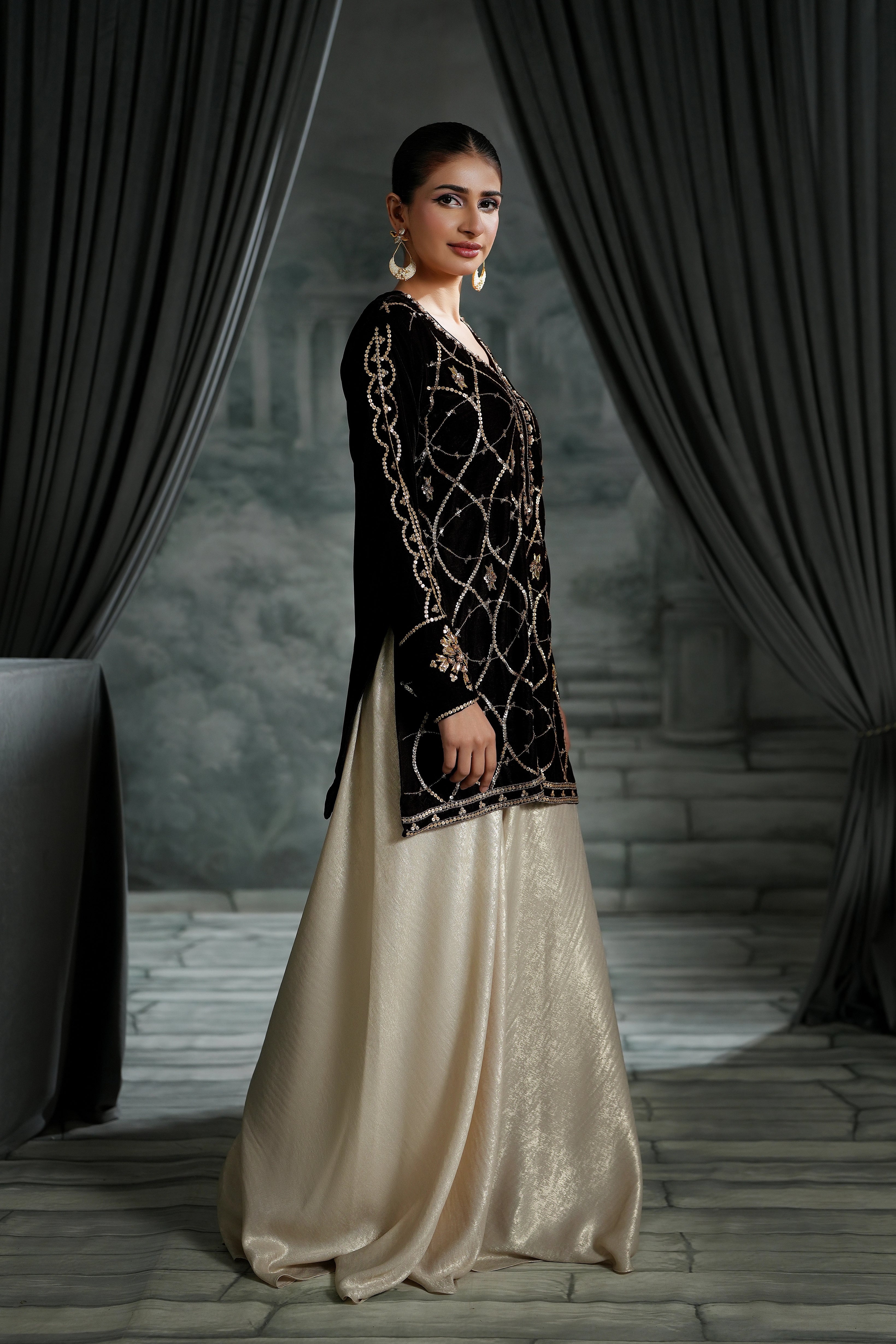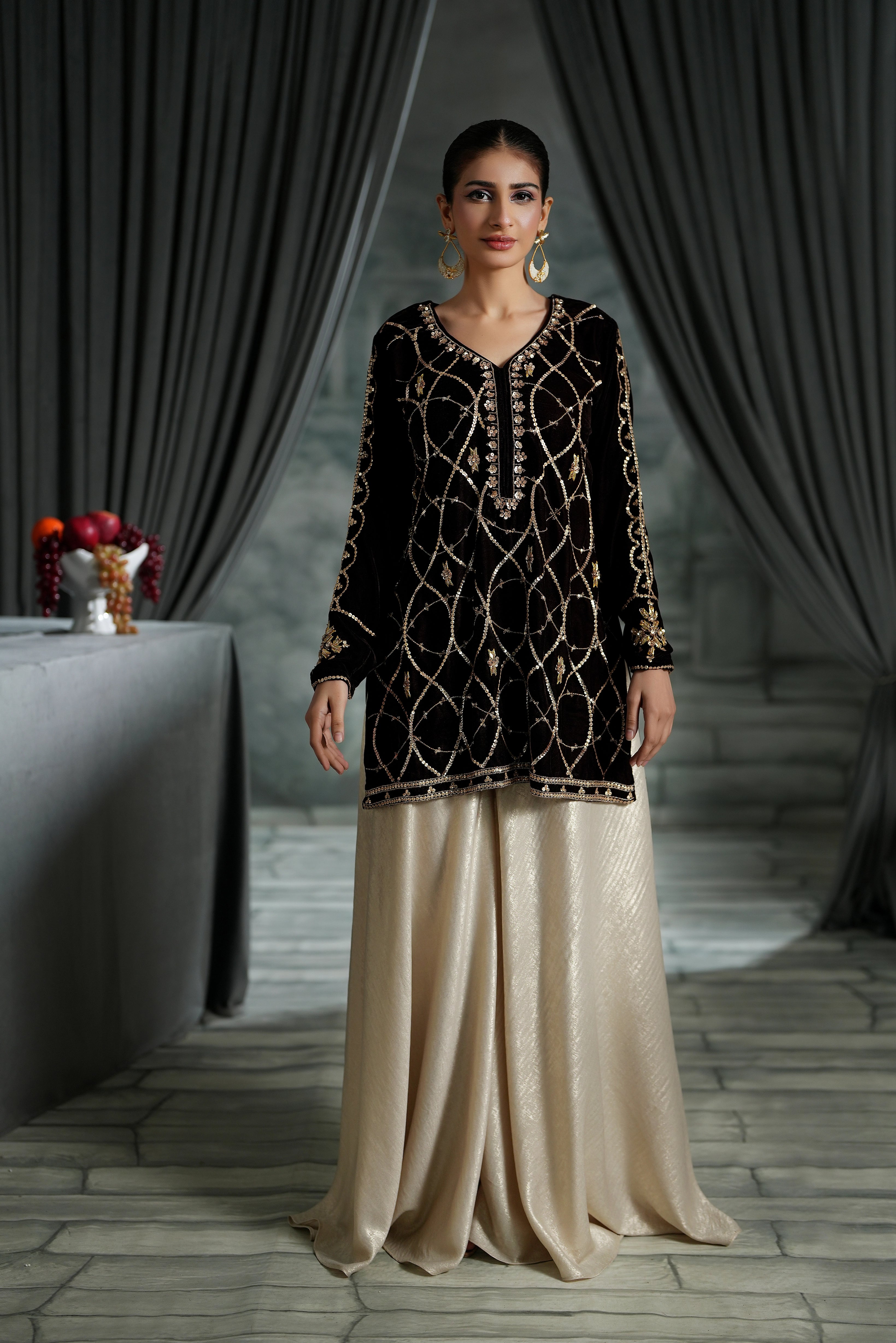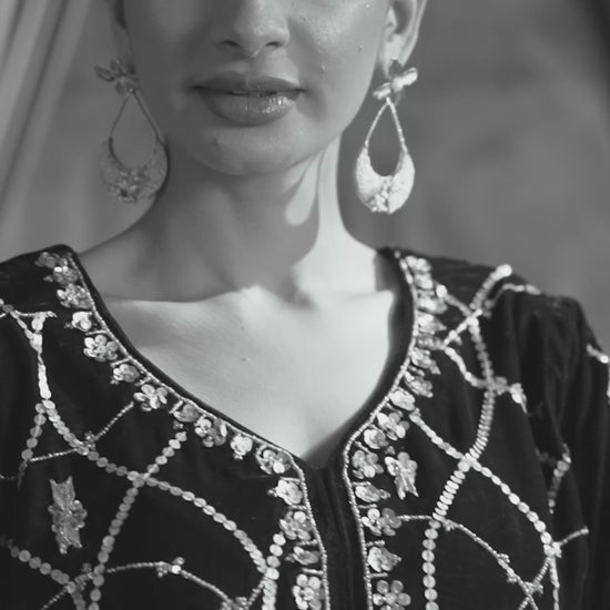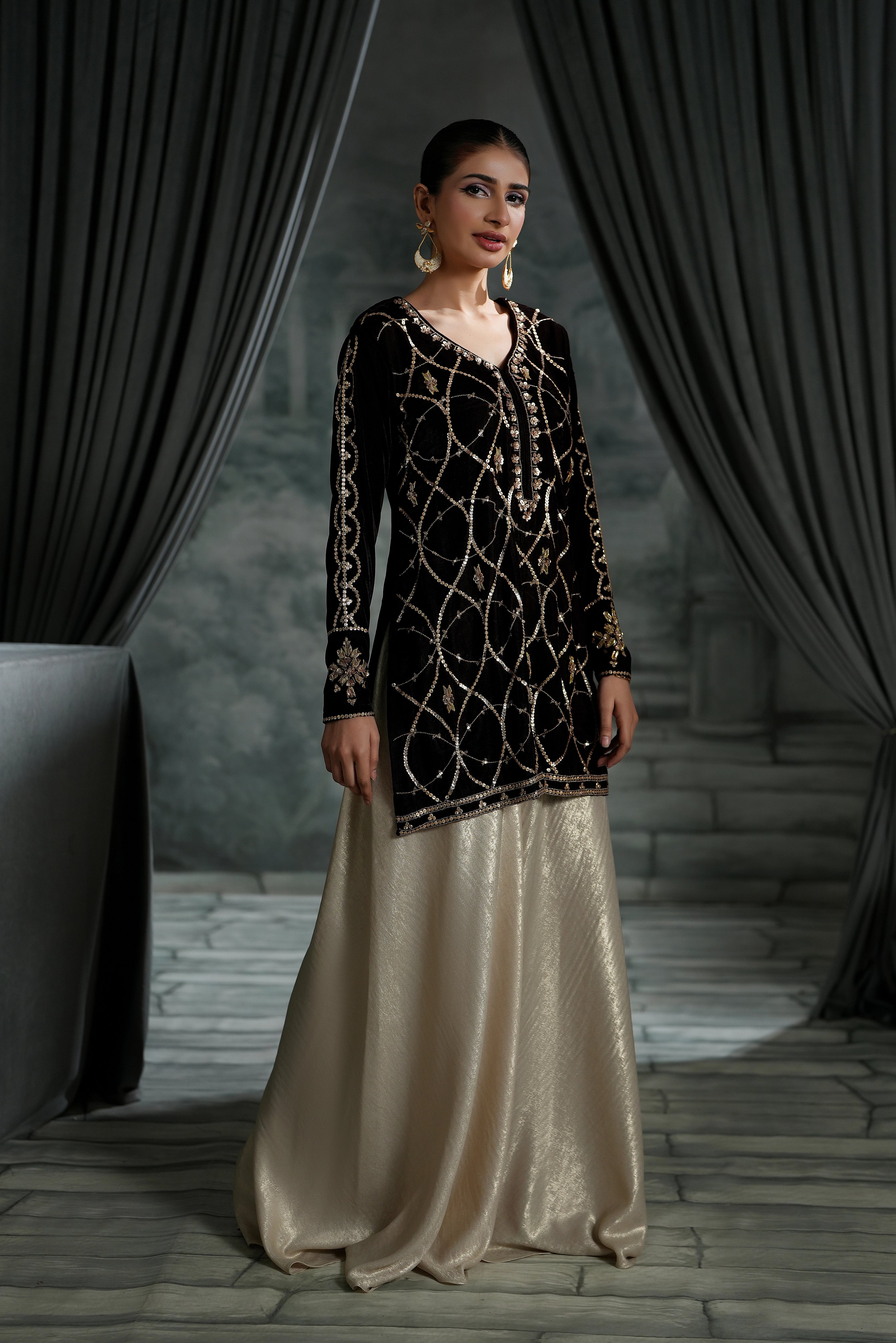 Indulge in the deep beauty of our Chocolate Brown Short Shirt. While the color is grounding and sophisticated, the details make it unforgettable: featuring intricate sequins, traditional Gotta work, and dazzling crystal embellishments.